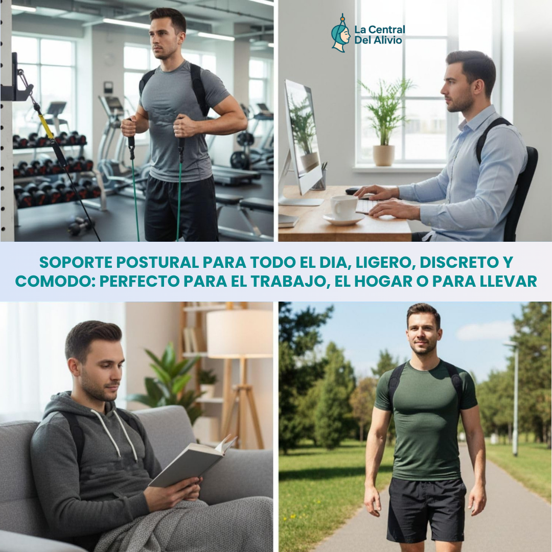 Funciona alineando suavemente la columna y evitando que te encorves, especialmente cuando pasás muchas horas sentado, trabajando o usando el celular.